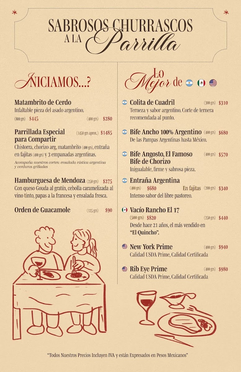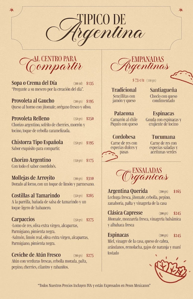 Restaurant Bar Argentino, nestled in Tepic’s Cd del Valle, offers an authentic Argentinian dining experience characterized by rich flavors and expertly prepared dishes. The menu highlights succulent steaks, cooked to perfection, such as the Ribeye and the popular Matambre, delivering bold, intense flavors that captivate the palate. Starters like empanadas are a savory introduction to the meal, while the caprese salad adds a fresh, vibrant contrast. Though the grilled vegetables have transitioned to purées, this subtle change doesn’t detract from the overall quality. The pork belly and Tri-tip Colita de Cuadril showcase a commitment to hearty, traditional Argentinian fare, though textures may vary slightly. Complementing the cuisine is an excellent wine list that enhances each dish beautifully. Attentive service rounds out the experience, creating a warm and inviting atmosphere that makes this restaurant a must-visit for anyone craving genuine Argentinian flavors in Tepic.